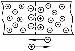 Електрони та дiрки можуть вiльно переходити через межу подiлу провiдностi. Оскiльки в лiвiй частинi напiвпровiдника i велика кiлькiсть дiрок, то вони вирушать у праву, а електрони тАУ навпаки, у лiву. Потрапивши до лiвоi частини з ртАУпровiднiстю, електрони почнуть рекомбiнувати з дiрками.