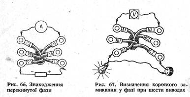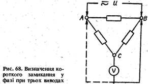 Пошук мiжвиткового короткого замикання ускладнюiться , якщо виведено лише три кiнцi обмотки i нуль не поданий на масу . Це означатиме , що фазнi обмотки зтАЩiднано в трикутник , а прикладена напруга (до точок А i В , рис.68) викликатиме струм не лише в обмотцi АВ , а й в двох iнших . Зрозумiло , що струм в однiй обмотцi буде бiльший струму в двох iнших . Зрозумiло , що струм в однiй обмотцi , де немаi короткого замикання .