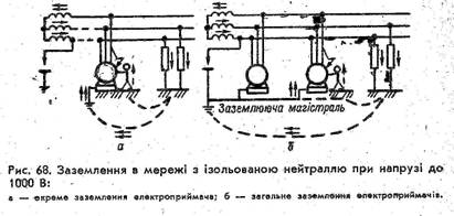 На рисунку 68 зображено заземлення електроприймачiв у мережах з iзольованою нейтраллю . У цьому випадку , якщо людина доторкнулася до корпуса електроприймача , що перебуваi пiд напругою , то вона приiднуiться до кола замикання на дiлянцi мiж корпусом i землею . Призначення захисного заземлення полягаi в тому , щоб створити мiж металевими конструкцiями або корпусом обладнання , яке захищають , i землею електричне зтАЩiднання достатньо малого (порiвняно з тiлом людини) опору або конструктивного так виконаного , щоб струм через паралельно приiднане тiло людини чи тварини знижувався до величини , яка не загрожуi iх життю i здоровтАЩю .