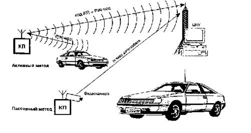 Однако на практике чаще используется инверсный метод приближения (рис. 1.3): обнаружение и идентификация транспортных средств осуществляется с помощью установленных на них активных, пассивных или полуактивных малоВнмощных радиомаяков, передающих на приемник контрольного пункта свой инВндивидуальный код, или же с помощью оптической аппаратуры считывания и расВнпознавания характерных признаков объекта, например, автомобильных номеров. Информация от контрольных пунктов передается далее в подсистему управления и обработки данных.