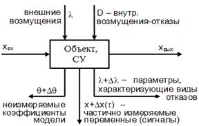 Необходимость в разработке научно обоснованных методов технической диагностики и технических средств для реализации диагностических систем и комплексов подтверждают результаты исследований, по которым установлено, что специалист 25% времени тратит на определенные части изделия, где произошла неисправность, 62% тАУ на определение неисправной детали и только 13% времени тАУ на восстановление отказавшей детали. Техническое диагностирование использует технические математические модели. Отличие диагностических моделей от обычных математических моделей, которые отражают номинальный режим функционирования объекта или системы управления состоит в том, что диагностическая модель описывает существенные свойства аварийных режимов, вызванных различными отказами. Объект или система при разработке диагностической модели рассматриваются по следующей схеме (рис. 3.):