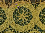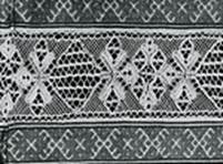 Скань, проложенная по самой полосе полотнянки, образующей узор, является особенностью сцепного кружева XIX века. В Вологде позднее других, ближе к середине столетия, обратились к этому приему. Рельеф возник, но фоны не стали прозрачными, плетешок и насновки все еще тяжелы по фактуре, решетки густые. Скань ВлелочкойВ», введенная в полотнянку второго подзора, помогает отнести его к середине XIX столетия.