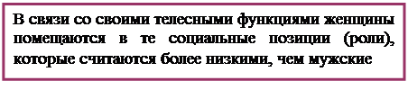 Таким образом, оппозиция женского и мужского становится оппозицией природного и культурного: во всех обществах женщины рассматриваются как часть природы и помещаются вне исторического времени и пространства культуры, а мужчины, как часть культуры, живут в истории, творят, преодолевают земные пределы и воплощают ВлчеловеческоеВ». То, что делают женщины даже за пределами домашней сферы, девальвируется, потому что это делают женщины, но это не предопределено природой, а сконструировано культурно.