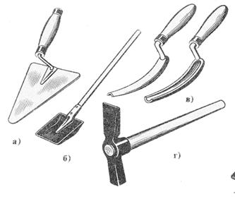 Розчинна лопата (рис. 1 б), розчинна лопата призначена для роботи з розчином, а саме подання та розстилання розчину на стiнi. Лопатою також перемiшують розчин у ящику i розрiвнюють його мiж верстами пiд забутку.