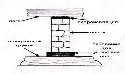 Спочатку зрiзують рослинний грунт i на його мiсце укладають суху землю, яку ретельно утрамбовують, зволожують. Потiм у неi утоптують щебiнь або гравiй на глибину не менше 4 см. Таку основу роблять вище рiвня зовнiшнього вимощення не менше нiж на 10-15 см. На вирiвняну укладену основу укладають цеглянi стовпчики 25x25 см заввишки в 2 ряди кладки (15 см). Вiдстань в ряду стовпчикiв вздовж лаги залежить вiд висоти лаги. Зазвичай лаги беруть висотою 8 см iз брусiв 6x8 см або з полу брусiв дiаметром 16 см. У цьому випадку зазначена вiдстань повинна становити 80-100 см.