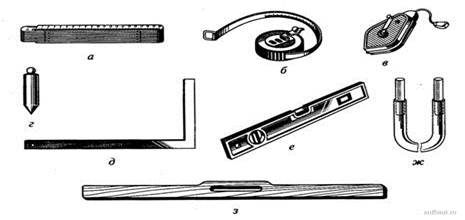 Рисунок 2. РЖнструменти для вимiрювання та перевiрки обробляiмих поверхонь: а - метр складний; б - рулетка; в - Розмiчальний шнур; г - висок; д - кутник; е - будiвельний рiвень; ж - водяний рiвень; ж - рейка-правило.