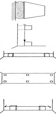 3. Потiм уздовж цiii лiнii по периметру кiмнати укладають дошки, на якi спиратимуться плитки плiнтусового ряду. Пiсля закiнчення облицювання цi дошки виймають.