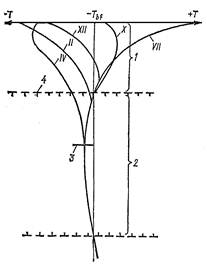 Поэтому в результате развития вертикальных сил пучения, превышающих вес столба и силы бокового трения, грунт увлекает за собой столб вверх и вырывает его из нижележащих слоев грунта. При этом под столбом образуется полость, которая заполняется водой или разжиженным грунтом (II на рис. 44). При полном промерзании сезонноталого слоя в полости замерзает лед (или ледогрунт) (III). В процессе весеннего оттаивания грунта, пока оно не дойдет до подошвы столба, последний сохраняет наиболее высокое положение, достигнутое при выпучивании (IV). После оттаивания льда в полости происходит частичная осадка столба. Однако в. годовом цикле столб оказывается выпученным на какую-то высоту Ah (V на рис. 44). При ежегодном повторении такого процесса столб настолько выпучивается вверх, что теряет устойчивость и падает (VI). При заглублении столба в мерзлую толщу ниже сезониоталого-слоя его выпучиванию дополнительно противодействуют силы смерзания с многолетнемерзлой породой. Если эти силы и вес столба больше, сил пучения, то столб не выпучивается; если меньше тАФ он ВлвыдергиваетсяВ» из мерзлой толщи.