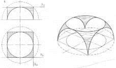 На рис.4 показан парусный свод. Если от полусферического сегмента помимо четырех боковых частей отсечь горизонтальной плоскостью S верхнюю часть, то получится парусный свод. В результате этого сечения получается горизонтальная окружность, которая опирается на четыре арки. Основой парусного свода является переходная форма от его нижнего квадратного основания к его верхнему цилиндрическому объему.