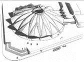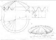 На рис. 11 дано изображение покрытия Даниловского рынка в Москве, напоминающее цветок из четырнадцати переплетающихся лепестков. Общая форма оболочки близка к складчатому сферическому сегменту. Складчатая форма покрытия, каждый элемент которой тАУ кривая поверхность переменной положительной кривизны, придают покрытию большую пространственную жёсткость. При диаметре сооружения больше 70 м толщина оболочки составляет 3 тАУ4 см .