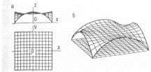 На рис.12 дана схема покрытия, представляющая собой минимальную поверхность с контуром, состоящим из четырёх дуг окружностей. Поверхности этого вида имеют наименьшую площадь при заданном контуре и одинаковую напряжённость в любой точке. Форма поверхности зависит только от формы кривой контура, отдельные её участки имеют положительную и отрицательную переменную кривизну.