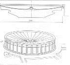 На рис. 14 показан фасад, план и общий вид спортивного зала в Кагаве (Япония), напоминающего корпус корабля. Вантовое покрытие зала представляет собой отсек поверхности, близкой к гиперболическому параболоиду, заданному двумя семействами кривых. Боковые участки тАУ линейчатая поверхность цилиндроида являются пространственные кривые борта и днище корпуса корабля, имеющие различную кривизну, а образующая тАУ прямая, параллельная направляющей плоскости. Сооружение стоит на четырёх опорных пилонах.
