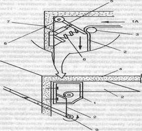 Рис.1. Закрепление багетов для натяжного потолка: 1 - корпус рейки крепления; 2 - пластиковая пленка; 3 - валик; 4 тАУ потолочное перекрытие; 5 - рычаг; 6 - пружина рычага; 7 - выключатель; 8 - ось рычага; 9 - валик, необходимый для натяжения пленки Примечание. Источник: [1, 170]