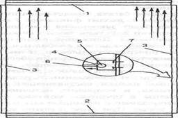 Рис.2. Способ закрепления краев пластиковой пленки натяжного потолка".1 - крепление для натягивания; 2 - рейка опорного фиксатора; 3 - продольные рейки; 4 - продольный разрез; 5 - прочный шнур из капрона; 6 - пленка; 7 - фиксатор боковой рейки к несущей стене.