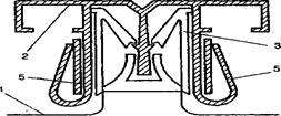 Рис.3. Элементы конструкции натяжного потолка фирмы ВлЕхtenzoВ»: а, б - с багетами из пластика; в - с алюминиевым разделителем; 1 - пленка; 2 - багет; 3 - гарпун полужесткий; 4 - накладка; 5 тАУ нагубник