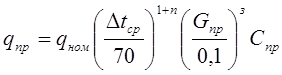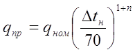Как следует из основного уравнения теплопередачи (2.55), плотность теплового потока приборов, являясь произведением коэффициента теплопередачи на температурный напор, заdисит от тех же факторов, что и коэффициент теплопередачи. Поэтому на практике для упрощения расчетов определяют с учетом всех факторов сразу плотность теплового потока отопительного прибора q пр. Для этого используют так называемую номинальную плотность теплового потока.