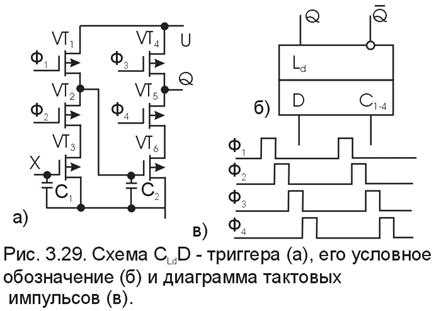 триггеры. Наиболее распространены триггеры двух- и четырехфазного действия. Схемы КТ выполняются с применением меньшего числа МДП-транзисторов, чем это необходимо для построения аналогичных триггеров статического типа. Сравнительная простота построения КТ позволяет выполнить их как на МДП-транзисторах p-типа, так и на дополняющих МДП-транзисторах (КМДП).
