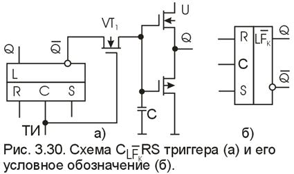 На рис. 3.30 показана обобщенная схема КТ на примере RS-триггера. Схема содержит следующие элементы: статический элемент памяти; схему формирования фазных импульсов (iИ); коммутирующий транзистор (VT1); динамический элемент памяти в виде емкости ВлСВ» затвора выходного инвертора; выходной инвертор. Статический элемент памяти выполнен в виде