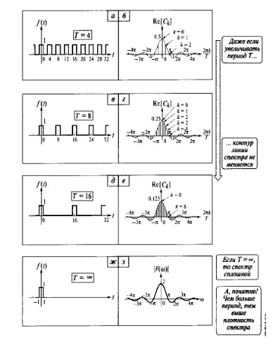 4. Если увеличивать количество гармоник, то точность приближения функции рядом Фурье повышается. 5. Под непрерывными кусочно-гладкими сигналами будем понимать сигнал, функция которого непрерывна в точке, причем возможно допустить устранимые разрывы первого рода. Область определения функции задается в каждом интервале, но она непрерывна (Пример: Фазоманипулированный сигнал). Рис. 1. Разложение сигнала 2. Интегральное преобразование Фурье Дискретное представление сигналов удобно для решения задач обработки сигналов, так как каждый сигнал может быть представлен конечным числом компонентов. Однако в теоретических исследованиях, особенно при рассмотрении сигналов на бесконечном интервале, с отличной от периодического закона распределения, такое представление либо недостаточно, либо не возможно. Но гармонический анализ периодических сигналов можно распространить на непериодические сигналы. При этом число гармонических составляющих, входящих в ряд Фурье, будет бесконечно большим, так как при Рис 2. Поэтому в выражении (1.3) можно заменить Внутренний интеграл является функцией называется спектральной плотностью или спектральной характеристикой. В общем случае, когда t1 и t2 не уточнены, спектральная плотность записывается в форме: Выражение (6) называют прямое преобразование Фурье Подставляя (6) в (4) получаем Выражение (7) называют обратным преобразование Фурье. 3. Интегральное преобразование Лапласа Преобразова́ние Лапла́са тАФ интегральное преобразование, связывающее функцию Данный спектральный метод, как и преобразование Фурье основан на том, что исследуемый сигнал представляется в виде суммы неограниченно большого числа элементарных слагаемых, каждое из которых изменяется во времени по закону Вместо комплексных экспоненциальные сигналов с чисо мнимыми показателями вводят в рассмотрение экспоненциальные показатели Изображения по Лапласу во всех точках комплексной плоскости являются аналитическими функциями. На практике применяют таблицы соответствия между оригиналами и изображениями. 3 Интегральное преобразование Гильберта Часто радиоинженер сталкивается с радиосигналами, получаемые в результате одновременной модуляции амплитуды и частоты(или фазы) по очень сложному закону. Предполагая, что заданный сигнал При этом возникает неоднозначность из-за того что, Неоднозначности можно избежать, при представлении где Эти соотношения называют преобразованиями Гильберта, а функция В точках, в которых Преобразование Гильберта для любого произвольного сигнала представляет собой идеальный широкополосный фазовращатель, который осуществляет поворот начальных фаз всех частотных составляющих сигнала на угол, равный 90о (сдвиг на /2). Применение преобразования Гильберта позволяет выполнять квадратурную модуляцию сигналов, в каждой текущей координате модулированных сигналов производить определение огибающей и мгновенной фазы и частоты сигналов, выполнять анализ систем обработки сигналов. 4. Аналитический сигнал Аналитический сигнал тАУ это один из способов комплексного представления сигнала, который применяется при анализе сигналов и систем их обработки. Он позволяет ввести в анализ понятия огибающей и мгновенной частоты сигнала. В современной радиотехнике представление колебаний в комплексной форме распро