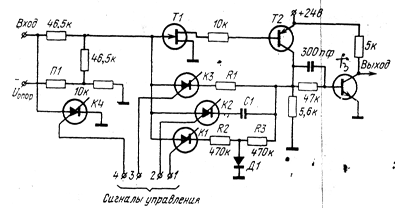 В схеме предусмотрены четыре pтАФnтАФpтАФn-переключателя, подключающих или отключающих Основные элементы и участки схемы. Сигналы на управляющие электроды переключателей подаются от внешних цепей. При включении только переключателя Кл1 схема работает следующим образом. Положительный входной сигнал вместе с опорным напряжением, снимаемым с делителя П1, подается на затвор полевого транзистора 77. При достижении потенциала насыщения полевой транзистор открывается и включает в работу обычный биполярный транзистор Т2, который в свою очередь открывает диод Д1. В результате на вход схемы через цепь о. с. подается небольшой по величине синфазный сигнал. Величину этого сигнала (коэффициент обратной связи) и запаздывание схемы можно регулировать, изменяя сопротивление цепи обратной связи, в частности R2. Выбирая это сопротивление достаточно большим, мы устанавливаем режим работы детектора уровня. Транзистор ТЗ согласует схему с нагрузкой. При включении только переключателя КлЗ (вместо цепочки R2, R3, Д1 включается R1) схема работает как бистабильный мультивибратор, запускаемый знакопеременной последовательностью импульсов. При включении только переключателя Кл2 (вместо R1 включается С1) и подаче на вход стробирующих сигналов схема работает как генератор стробов. При одновременном включении Кл2 и Kл4 (вход заземляется), а также при определенном подборе опорного напряжения Uоп схема работает как мультивибратор.