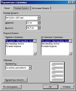 Стандартные параметры загружаются автоматически при создании нового документа. В окне параметры страницы есть три вкладки: поля, размер бумаги, источник бумаги. Основные редакции вносятся во вкладке поля (верхнее, нижнее, левое, правое тАУ устанавливаются отступы, положение переплата: слева или справа; ориентация: книжная или альбомная; можно выбирать количество страниц которое можно разместить; можно установить применить ко всему документу или к какой - то его части; также можно нажать кнопочку по умолчанию в левом нижнем углу, и установятся установки стандартные).