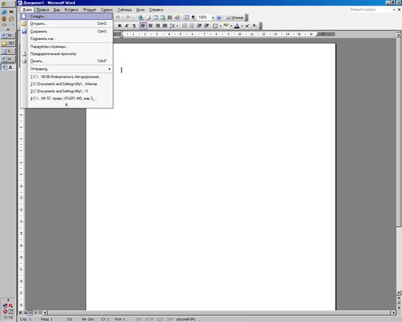 Создание нового документа можно произвести разными способами, например таким: на пустом месте на рабочем столе щелкнуть правой кнопкой мыши и выбрать создать документ Word; либо Пуск тАУ Программы тАУ MS Цщкв, Как правило открывается новый документ сразу после запуска программы, либо создать новый документ (Файл - создать).