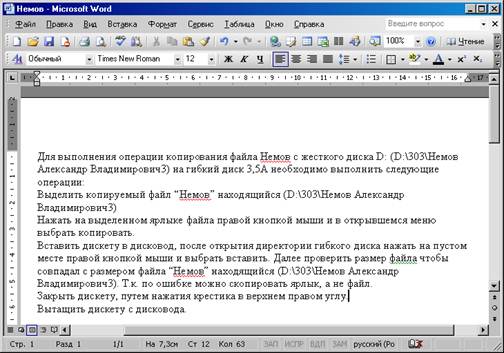 В открывшемся (сохраненном) документе записываем последовательность операций, необходимых для выполнения копирования данного файла на гибкий диск. Записываем полное имя копируемого файла.