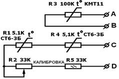 И еще одна особенность. Промышленность выпускает СТ6-ЗБ только в пределах 1 кОм.,.10 к0м, поэтому при калибровке термометра необходимо ус-танавливать несколько термокомпенсационных резисторов, соединенных по-следовательно. Электрическая схема термодатчика приведена на рис.3.