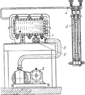 1 тАФкамера; 2 тАФнасос; 3 тАФ дифференциальный манометр; 4 тАФ соединительный штуцер; 5 тАФ вентиль контроля давления; 6 тАФ вентиль регулировки давления.