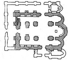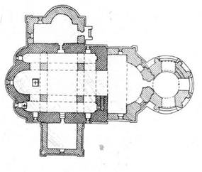 Витягнутий зi сходу на захiд прямокутник плану собору (довжина сторiн 29,5x19,2 метрiв всерединi) дiлиться чотирма парами могутнiх, хрещатих у планi стовпiв та аркадами на бiломармурових колонах на три нерiвнi частини тАФ нефи, серед яких центральний удвiчi бiльший за боковi. Зi сходу нефи закiнчуються трьома напiвкруглими вiвтарними в