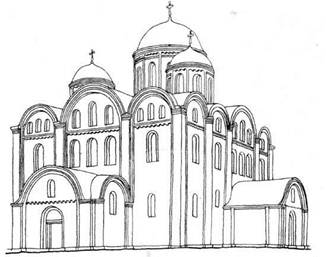 Цей протест i разом з тим iдеi iдностi втiлюються в архiтектурi монументальних кам'яних храмiв того часу. Зовнi споруда маi вигляд стрункоi башти майже квадратного плану (його розмiр без схiдних пiвкруглих виступiв-апсид приблизно 11х13 метрiв), увiнчаноi стрункою банею. Оригiнально вирiшено тут перехiд в трикутника основи до барабана банi за допомогою триступiнчастих арок-закомар та пiварок-аркбутанiв Завдяки цьому спорудi притаманна риса динамiчного руху вгору i пiрамiдальнiсть завершення.