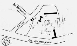 1 тАФ Успенський собор; 2 тАФ усипальниця Лизогуба; 3 тАФ палатний корпус; 4 тАФ дзвiниця; 5 тАФ келii (схiдний корпус); в тАФ трапезна i Петропавловська церква; 7 тАФ келii (пiвденно-захiдний корпус); 8 тАФ руiни корпусу настоятеля; 9 тАФ вхiд до печер XIтАФXVIII ст.; 10 тАФ будинок Феодосiя; 11 тАФ курган ВлЧорна могилаВ».