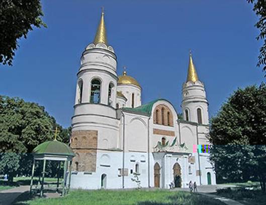 В самому центрi Чернiгiвського валу тАФ стародавнього Дитинця тАФ височить величезна архiтектурна споруда, увiнчана п'ятьма пiвсферичними куполами та конусоподiбними верхами. Це тАФ Спаський собор, унiкальна архiтектурна пам'ятка початку XI сторiччя.