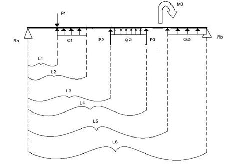 L1=10м, L2=17m, L3=22m, L4=25m, L5=32m, L6=40m, P1=24000H, P2=34000H. P3=290000H, Q1=24000H/m, Q2=21500H, Q3=15000H, и M0=12500H*m,