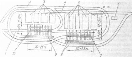 На рисунке приведена технологическая схема прирельсового нижнего склада с годовым грузооборотом 30тАФ50 тыс. м3.