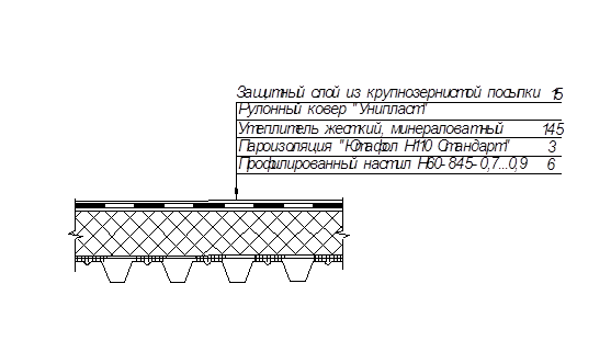 | 6 | Толщина слоёв, м Профилированный настил, 7850 кг/м³ Пароизоляция Ютафол, 600 кг/м³ Утеплитель минераловатный 40-60 кг/м³ Рулонный ковер Унипласт |