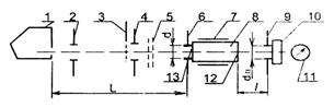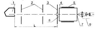 1 - осветитель; 2 - светозащитные диафрагмы; 3 - диафрагма с калиброванным отверстием; 4 - ЭОП; 5 - держатель ЭОП; 6 - микроскоп; 7 - экран ЭОП; 8 - фотокатод ЭОП