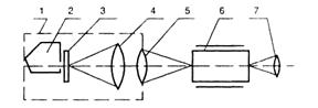 1 - проектор; 2 - осветитель; 3 - мира; 4 - объектив коллиматора, 5 - проекционный объектив; 6 - ЭОП; 7 - окулярная оптика