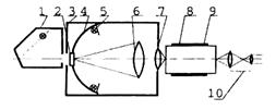 1 - осветитель; 2 - диафрагма с щелевой прорезью; 3 - оптика переноса изображения; 4 - ЭОП; 5 - микроскоп-визир; 6 - оптика переноса изображения; 7 - анализирующий растр; 8 - устройство обработки и регистрации сигнала; 9 - приемник излучения; 10 - полупрозрачное зеркало.