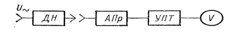 Вольтметр средневыпрямленного значения (рис. 2.3.) состоит из входного делителя напряжения ДН, широкополосного транзисторного усилителя ШУ, выпрямительного преобразователя Пр и магнитоэлектрического индикатора.