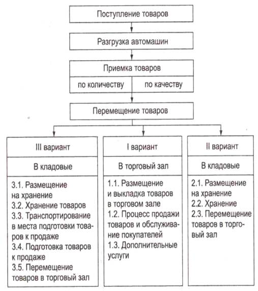 При любой из них весь технологический процесс можно разделить на несколько этапов. Первый этап включает операции с товарами до предложения их покупателям в торговом зале. К ним относятся: разгрузка товаров, приемка и подготовка их к продаже, создание требуемого режима хранения.