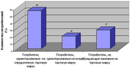 Из Рис.3 видно, что больше половины потребителей имеют четкие марочные предпочтения, однако для новых производителей все еще имеются не плохие шансы для выходы на рынок: 18% потребителей готово пробовать новые торговые марки, а 27% - вообще не обращают внимание на торговую марку продукции, приобретаемую ими.