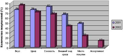 Поэтому, как для новых производителей, так и для тех, которые прочно закрепились на рынке, но хотят увеличить количество своих приверженцев, важным вопросом остается вопрос о приоритетах конечных потребителей продукции. Вызвало ли изменение лидера рынка изменение приоритетов покупателей? Или наоборот, смена лидера есть показатель смены приоритетов? Исследования октября 2002 года показали, что за год произошли изменения тех характеристик, которые влияют на принятие решения покупателем о приобретении продукции того или иного производителя (Рис.4).