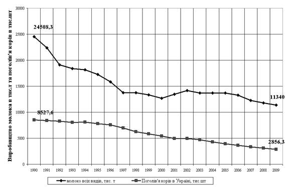 Рис.1.1. Динамiка поголiвтАЩя корiв в Украiнi та загального обсягу виробництва молока в 1990 тАУ 2009 роках за даними Держкомстата Украiни