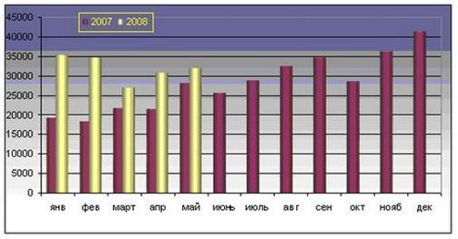 Белорусский экспорт сыров и творога в 2007 г. вырос относительно 2006 г. на 56,8% в стоимостном выражении и на 19,9% тАФ в физическом. Динамика экспорта Республики Беларусь в январе 2007- мае 2008 г. сыров и творога, в тоннах и в долл. представлена на рисунке 1.3 и на рисунке 1.4.