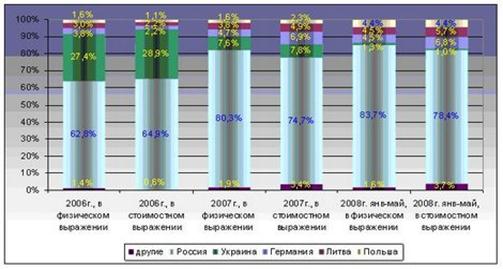 Доминирующее положение на белорусском рынке сыров и творога среди стран-поставщиков принадлежит в рассматриваемом периоде Российской Федерации. В 2007 г. импорт российской продукции достиг объема 2,8 тыс. т на сумму 9,6 млн. долл., в январе-мае 2008 г. тАФ 1,1 тыс. т на сумму 4,5 млн. долл. (относительно аналогичного периода 2007 г. тАФ 137,5% в стоимостном и 96,8% в физическом выражении).