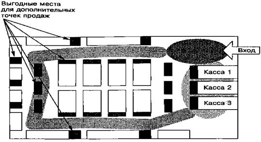 Дополнительные места продажи, как правило, организуются для самых продаваемых позиций товарной группы (для товаров с высоким оборотом) и товаров импульсного спроса. Дополнительные точки продажи располагают сообразно движению потока покупателей в торговом зале. Чаще их размещают при подходе к кассам, но эффективно действуют и дополнительные точки, расположенные по внешнему периметру торгового зала (в соответствии с правилом ВлперекрестногоВ» мерчандайзинга), а также вначале торговых линий.