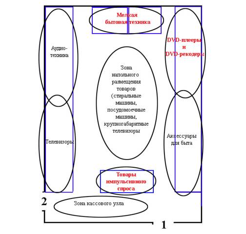 Мы считаем такое размещение товаров по ходу движения покупательского потока рациональным. Небольшие бытовые товары, приобретаемые по невысокой цене можно купить, не углубляясь в торговый зал магазина, практически рядом с кассовым узлом. Таким образом, покупатели, пришедшие за более серьезной покупкой, например, стиральной машиной и покупатели, ВлзабежавшиеВ» купить пару дисков, не мешают друг другу.