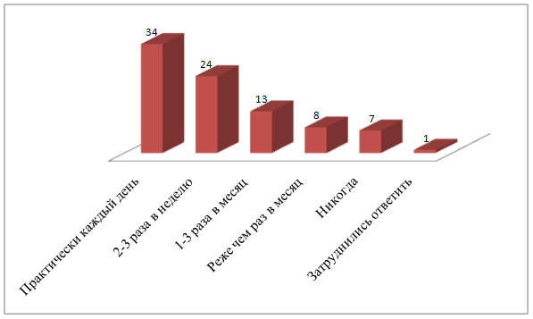 Доля активных потребителей майонеза, то есть тех, кто употребляет данный продукт практически каждый день, составляет 34% (рис. 1). От одного до трех раз в неделю его потребляют около 37% опрошенных. Несколько раз в месяц данный продукт используют 13% россиян. Только 7% от общего числа опрошенных респондентов ответили, что никогда не употребляют майонез.