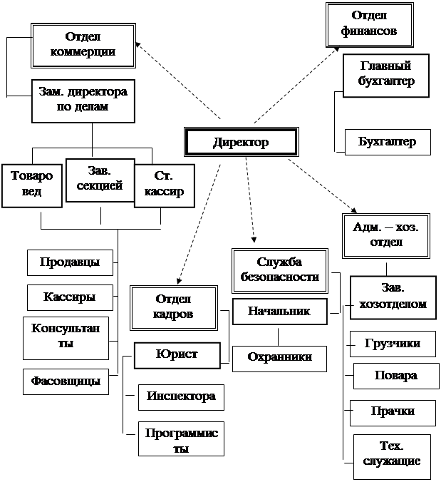 На современных предприятиях наиболее распространена иерархическая структура управления. И универсам ВлМечтаВ» не является исключением, так как там есть руководители, специалисты и исполнители, то есть подчинение нижестоящего уровня вышестоящему.